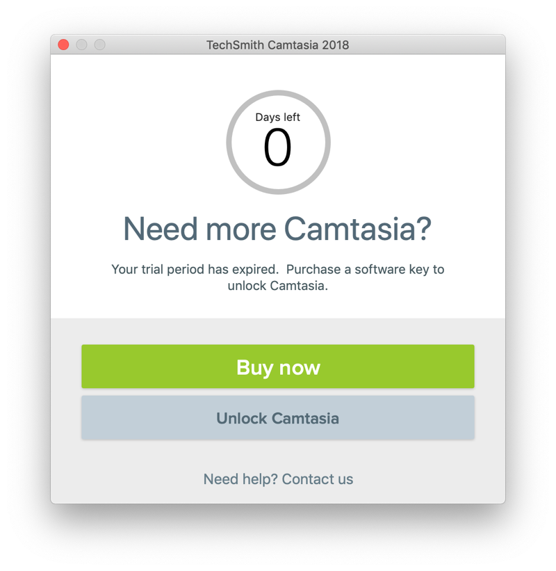 さてこのCamtasia 2018 for Mac、厄介なことにライセンスキーを入力しても、それが保持されず毎回起動のたびにライセンスキーを聞いてきます。さらに、Free Trialの30日を過ぎるとStart Recordingを選んでもTrial Expiredとなり結局何もできません。